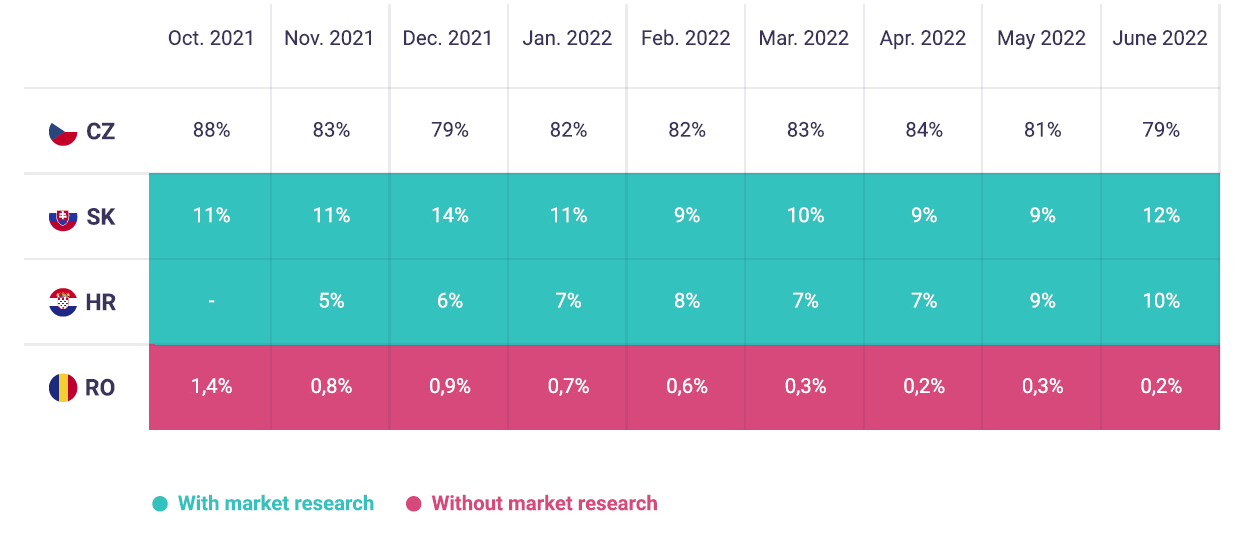 Percentage comparison of turnover in countries where there has been expansion with/without market research: