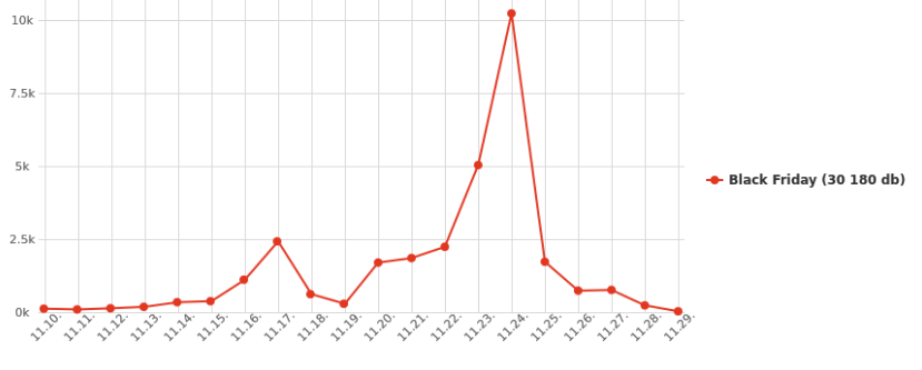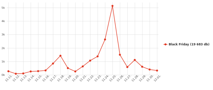 The data from the 4 largest online stores in Hungary (Edigital, eMAG, Media Markt and Euronics) show a clear increase of the number of orders. During 3 weeks in 2016 week, 20,000 orders were registered, of which only 25% on Friday, 2017 orders increased to 30,000, with around 10,000 on Friday.