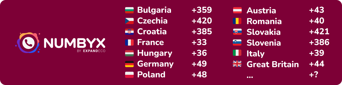The local telephone numbers of Western European countries (Austrian, German, French, Italian or British) are available within one day. Numbyx also covers local numbers from the Northern Balkans and Central and Eastern European countries (Croatian, Slovenian, Romanian, Czech, Slovak and Polish). Numbyx is constantly expanding its offer of local phone numbers and gradually adding more European countries to its offer. If you are interested in a specific prefix, you can write directly to sales@numbyx.com.
