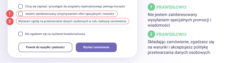 WSKAZÓWKA: Należy uważać na "gry słowne" i źle zdefiniowane zgody/braki zgody, które mogą być przedmiotem działań prawnych. Definicje muszą być jasne i nie mogą wprowadzać konsumenta w błąd.