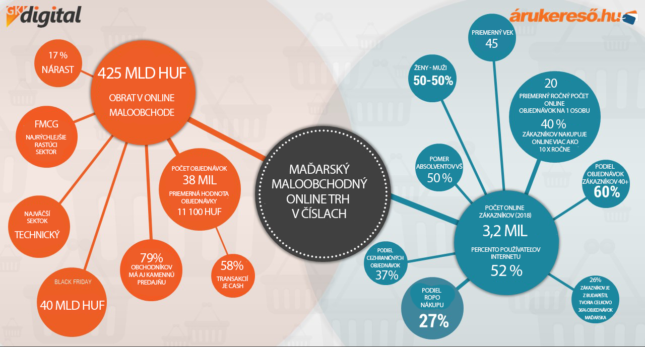 Spoločnosť GKI Digital v spolupráci s porovnávačom cien Árukereső publikovali výsledky za rok 2018, do prieskumu sa zapojilo až 3200 maďarských e-shopov a podľa prieskumu dosiahli obrat za rok 2018 425 miliárd forintov, čo znamená medziročný nárast o 17% a tvorí 4,5% z celkového maloobchodného predaja v Maďarsku.