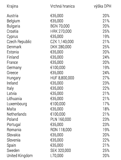 Hodnoty pre registráciu platcu DPH v jednotlivých krajinách: