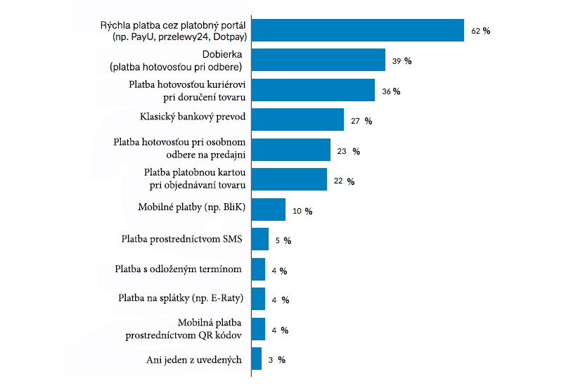 Takmer dve tretiny (62%) opýtaných potvrdzuje, že spôsob platby, ktorý motivuje k nakupovaniu online v Poľsku, je jednoznačne rýchla platba cez platobné portály. Vyše jedna tretina online užívateľov uprednostňuje dobierku (39%) alebo platbu kuriérovi (36%). Najmenej obľúbené a zároveň najmenej motivujúce sú mobilné platby, prípadne platby prostredníctvom QR kódov (4%), platby na splátky (4%) a odložené platby (4%).
